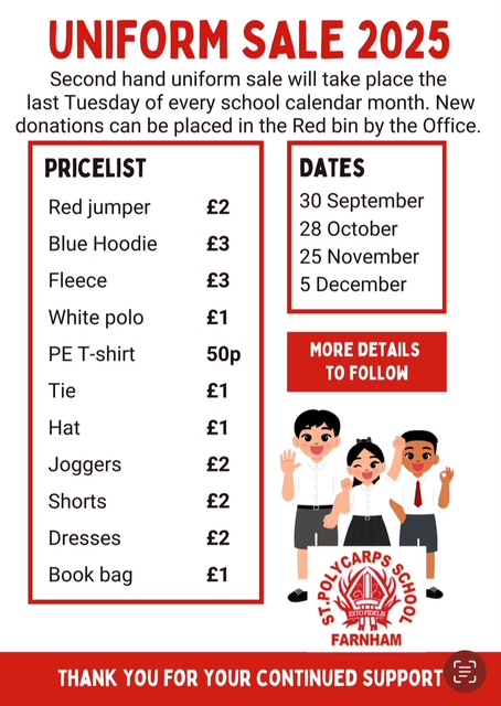 On the last Tuesday of every school calendar month, a second-hand uniform sale will take place.